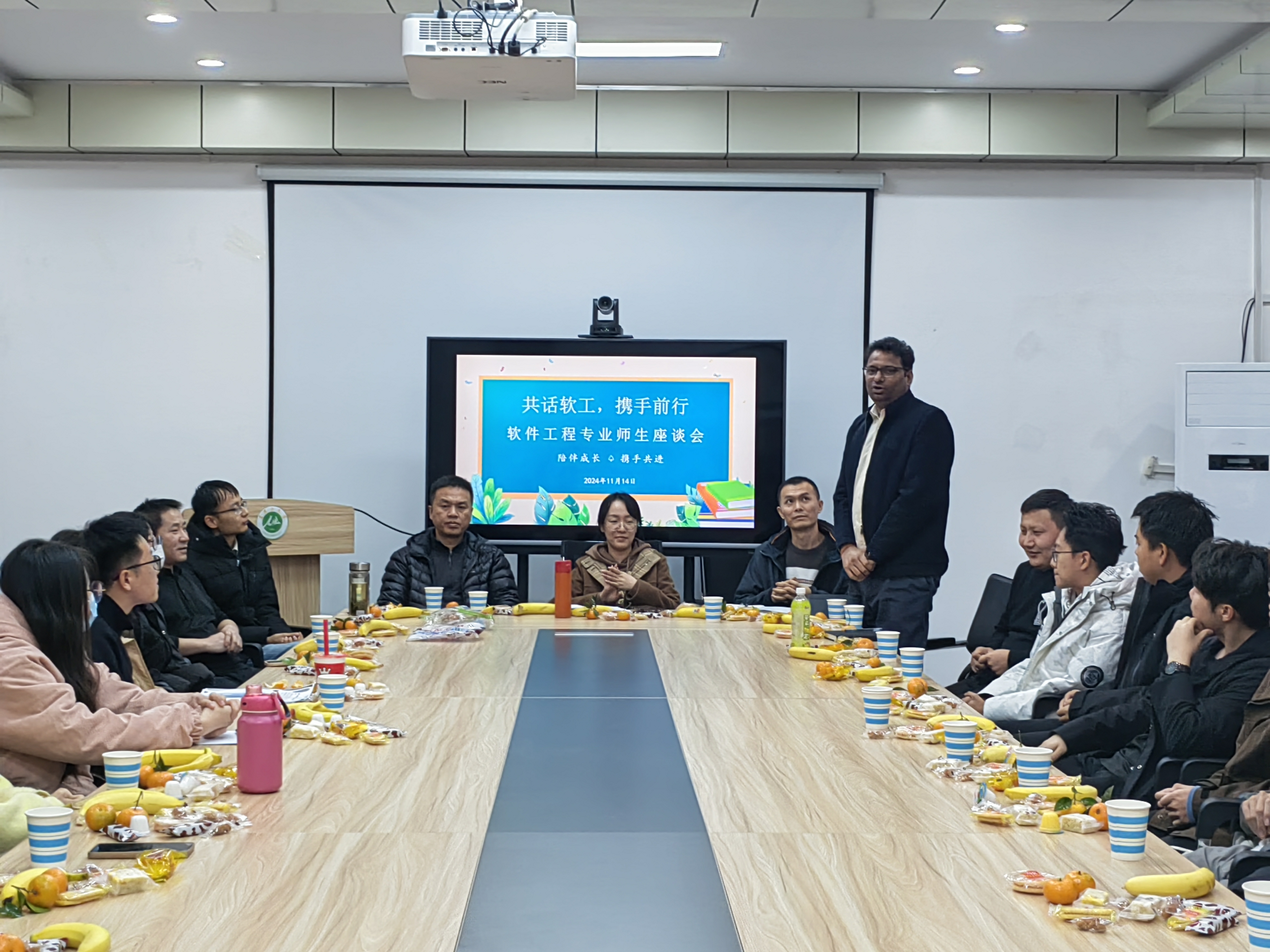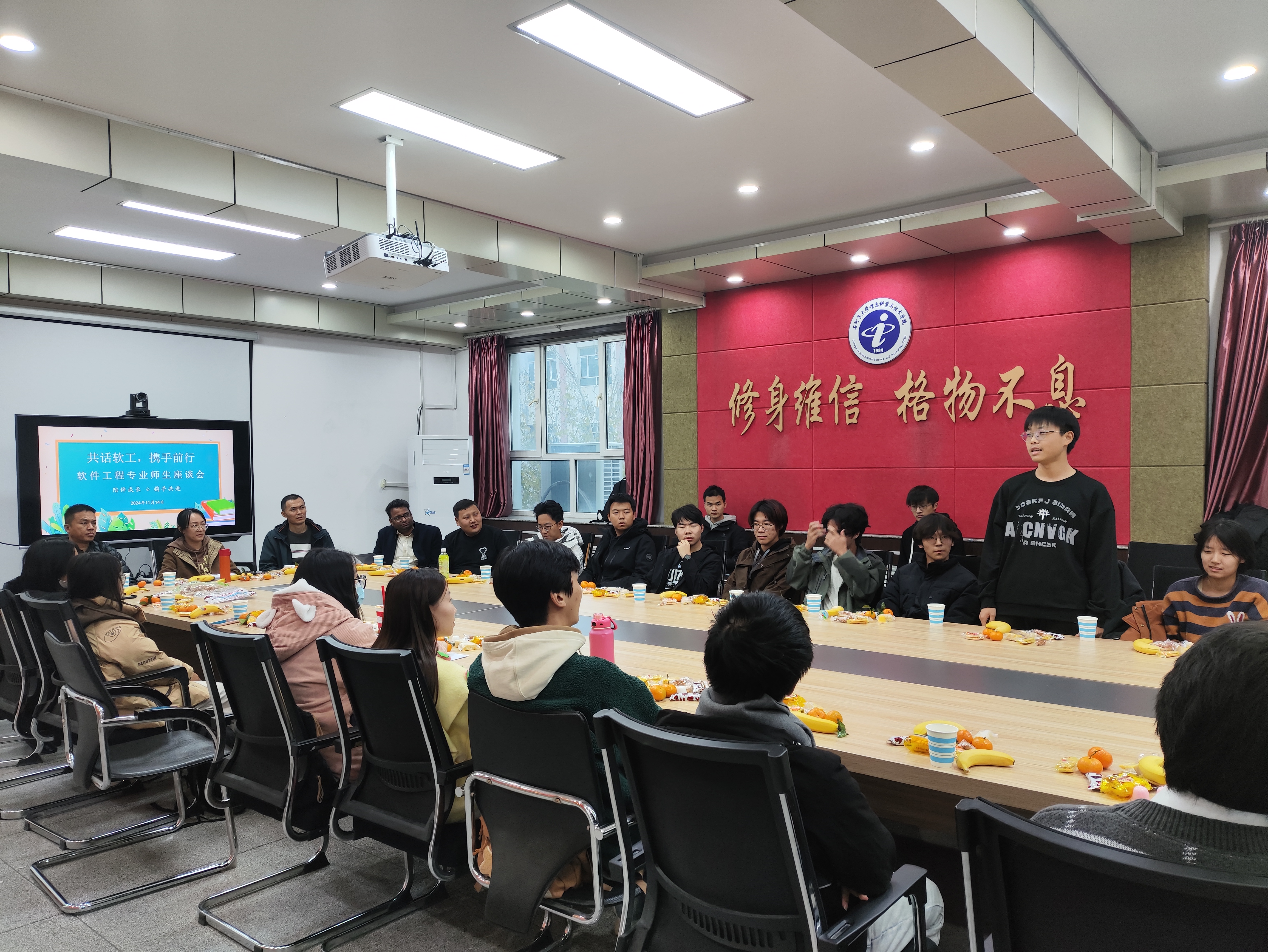 11月14日,软件工程专业师生相聚公司主楼三楼会议室,参与主题为“共话软工,携手前行”的师生座谈会。此次会议聚焦于深化师生间的沟通,交流课程学习、科研项目、研究生推免、志愿服务等方面的经验。会议由辅导员华瑞主持,软工系主任秦怀斌老师、外教DPS老师等教师以及各年级员工共40余人参与了此次座谈。