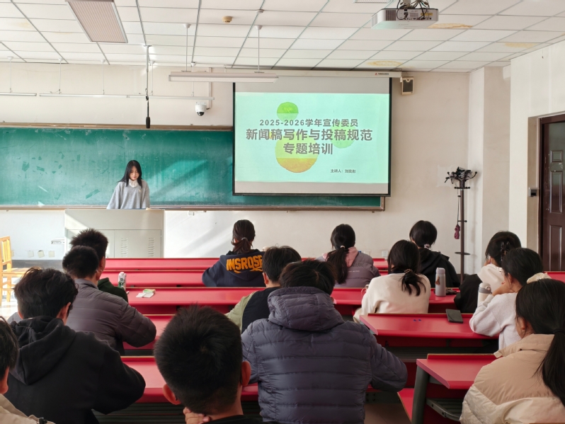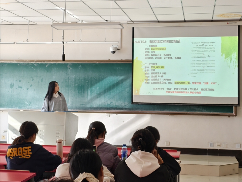 新闻采编部部长刘奕彤主持签到并担任主讲。她结合典型案例,对新闻稿的结构、语言风格及常见问题进行了细致剖析。本次培训围绕新闻写作基础、文档格式规范及投稿流程三大模块展开,通过系统讲解与实操指导,进一步提升宣传委员的宣传意识与写作能力。