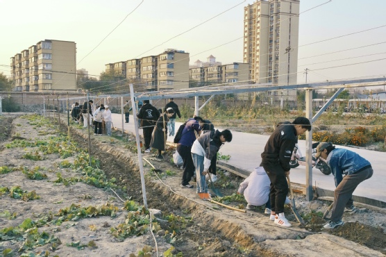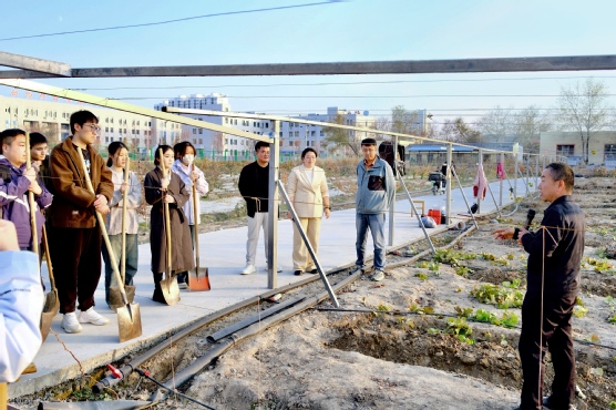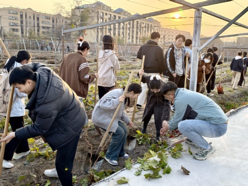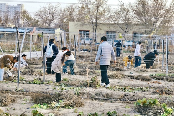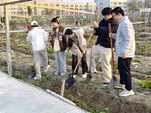 在老师们的组织下,同学们迅速分组投入劳动:两人一组分工协作,小心翼翼完成压蔓、埋土作业;后续以四人一组为单位,集中清理田间碎石,为来年葡萄生长改善土壤条件。现场分工有序、干劲十足,同学们严格遵循技术规范操作,在亲身劳动中熟悉了农业生产流程。