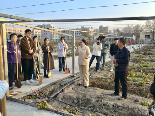 本次活动围绕葡萄冬季防寒作业展开。赵宝龙教授结合新疆冬季严寒漫长的气候特点,首先强调了葡萄冬季防寒对植株安全越冬的重要性,随后针对新栽葡萄苗抗寒性弱的实际情况,详细讲解了四大核心操作要点:统一向东侧压蔓、根部塑造“鸭脖弯”、埋土厚度20公分、取土时远离根系并清理石块。讲解结束后,赵教授现场示范铁锹埋土流程,反复叮嘱操作中的注意事项,帮助同学们快速掌握要领。