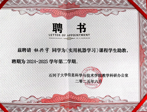求学路上,杜兴宇始终保持勤勉专注的态度。面对网络空间安全专业的核心课程,他不畏惧难点,课上认真紧跟老师思路,课下主动查阅资料、请教师长梳理知识体系。在《实用机器学习》课程学习中,他不仅自己吃透知识点,获聘助教后,也认真做好答疑辅导和作业批改。这段“教与学”双重身份的经历,让他对知识的理解更深了一层。“把知识讲明白,自己才真正学通了。”他这样总结。